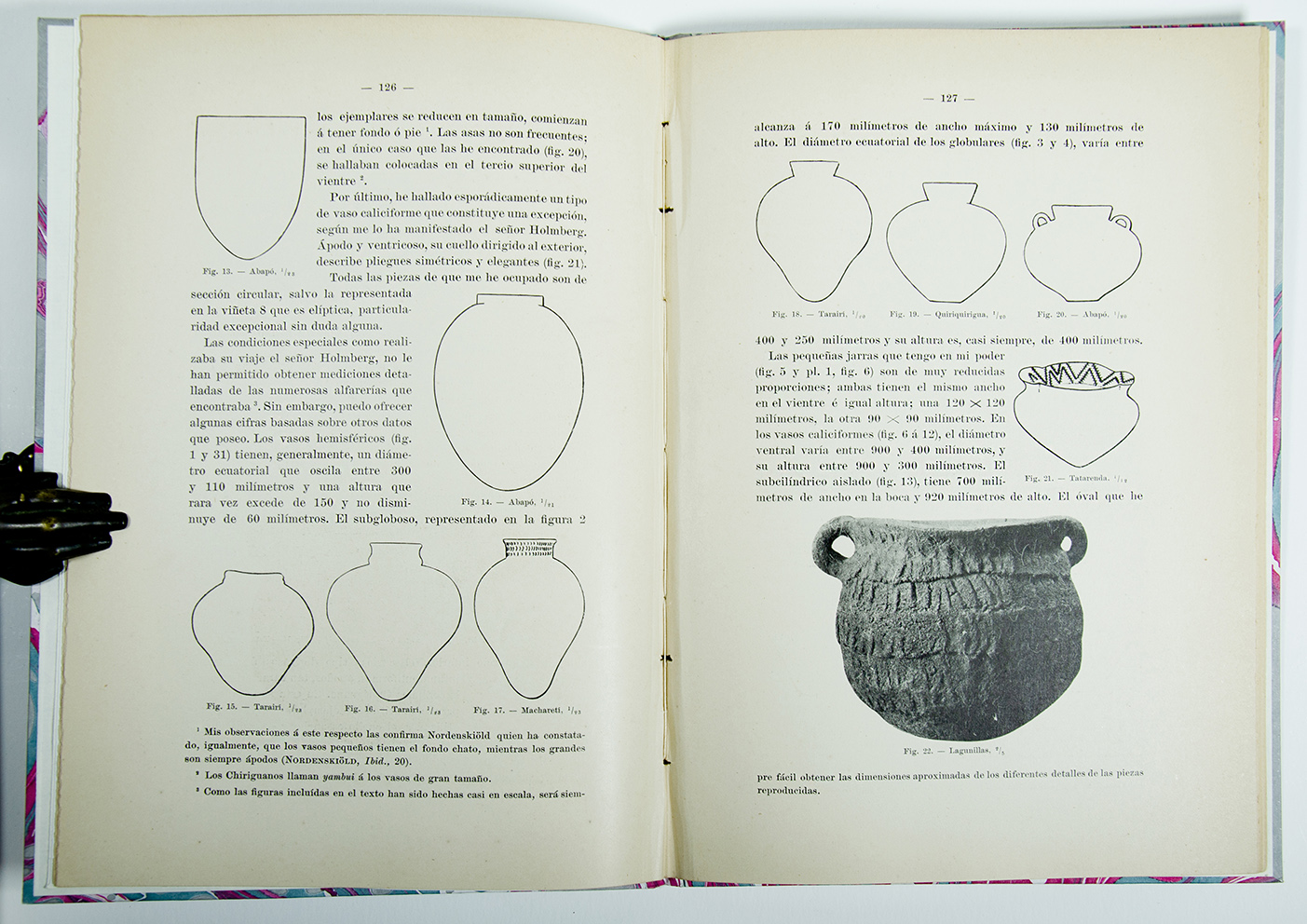 Interesante ensayo sobre la cerámica de los Chiriguanos que pueblan el oriente de Bolivia, sin duda con vinculaciones a estudiar respecto a sus paisanos habitantes del noreste argentino. Outes entiende que, a la fecha, su aporte es el más relevante -aunque advierte que los especialistas, en un futuro próximo, desarrollarán observaciones más amplias y prolijas-, y agradece la colaboración de su amigo Eduardo Alejandro Holmberg, quien viajó por la región enviado por la revista Caras y Caretas. Dibujos, croquis y fotografías enriquecen el texto.