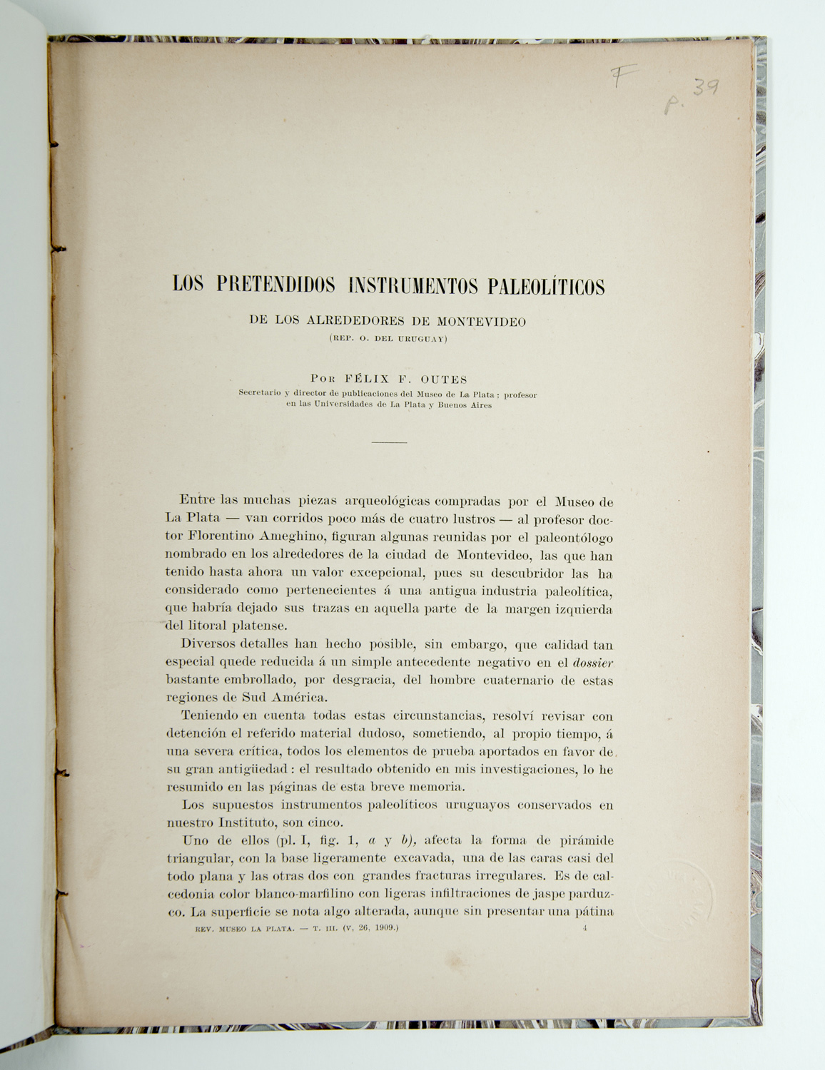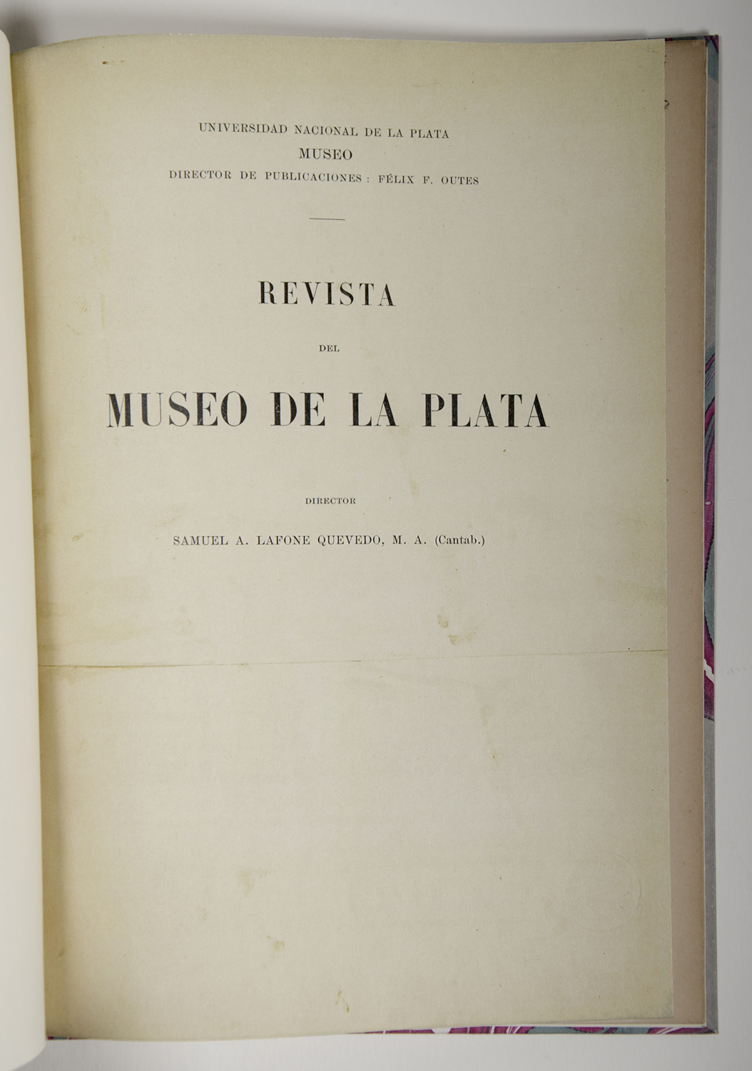 En 4° (25 x 18 cm), texto: 39-49 pp, + 3 láminas, con un facsímil de la tapa de la Revista del Museo de la Plata donde fue publicado. Encuadernación moderna de Andrés Casares. Sello seco de su anterior propietario.