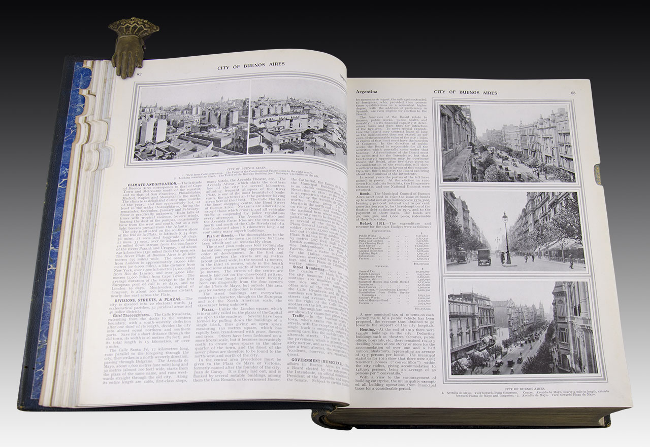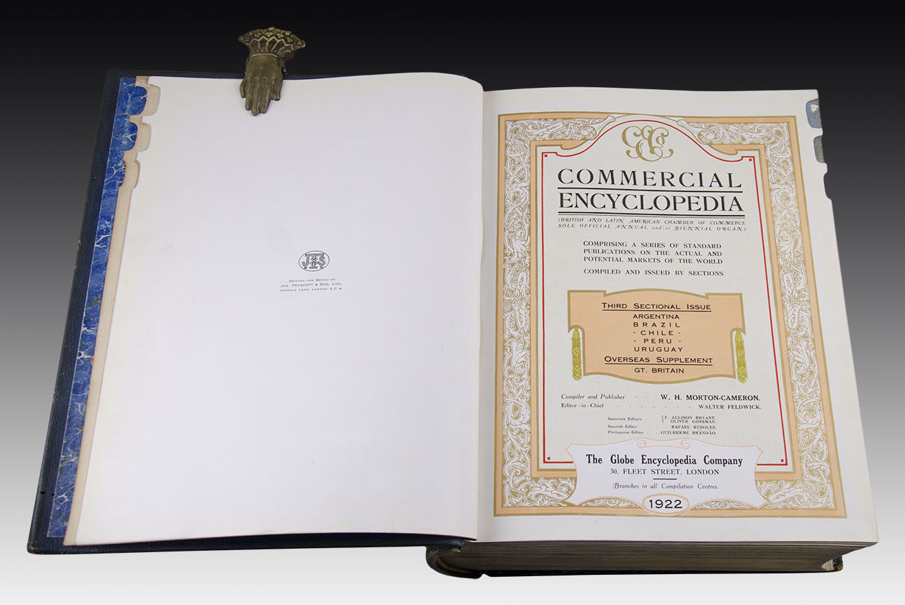 Commercial Encyclopedia. British and Latin American Chamber of Commerce Sole Official Annual and/or Biennial Organ. Comprising a Series of Standard Publications on the actual and Potential Markets of the World. Compiled and Issued by Sections. Third Sectional Issue: Argentina - Brasil - Chile - Peru - Uruguay. Overseas Supplement: Gt. Britain. Compiler and Publisher W. H. Morton-Cameron. Editor in Chief Walter Feldwick. The Globe Encyclopedia Company. London. Branches in all Compilation Centres. 1922.