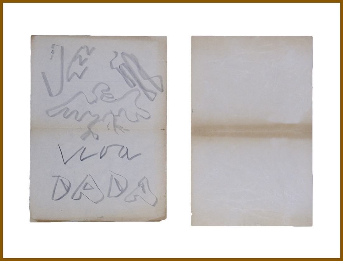 Cinco obras conservan estos papeles, cuatro de media carilla, y uno utilizando la página entera. Los primeros cuatro son “Homenaje a las piernas de la rubia”, junto a una figura femenina desnuda, realizada con grueso trazo de grafito; al lado una composición abstracta con líneas y movimientos orgánicos, y en la siguiente hoja, otra composición abstracta que combina líneas rectas y figuras geométricas con formas orgánicas y a la par, la inscripción “Muera Descartes / Viva Rimbaud”, y la firma del autor. Al dorso del papel la única creación de página completa, vertical. En ella el pronombre “Je” (yo en francés), un ave, y debajo “Viva Dadá”.