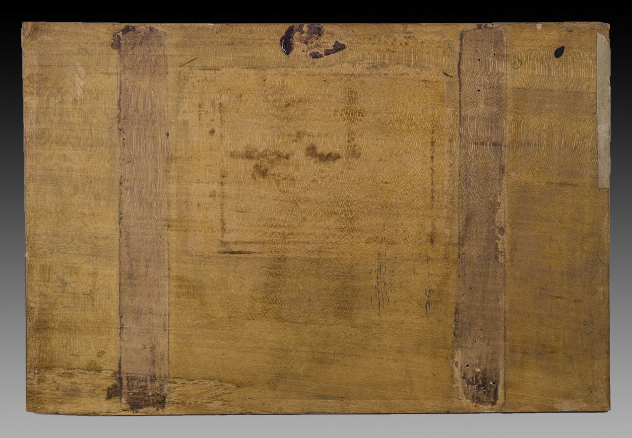 Óleo sobre tabla. Medidas: 21,7 x 32,4 x 0,5 cm. En el ángulo superior izquierdo, los números “14 - 3” marcados sobre la madera. Al dorso posee la huella de dos maderas verticales, y restos de papel y de un lacre.