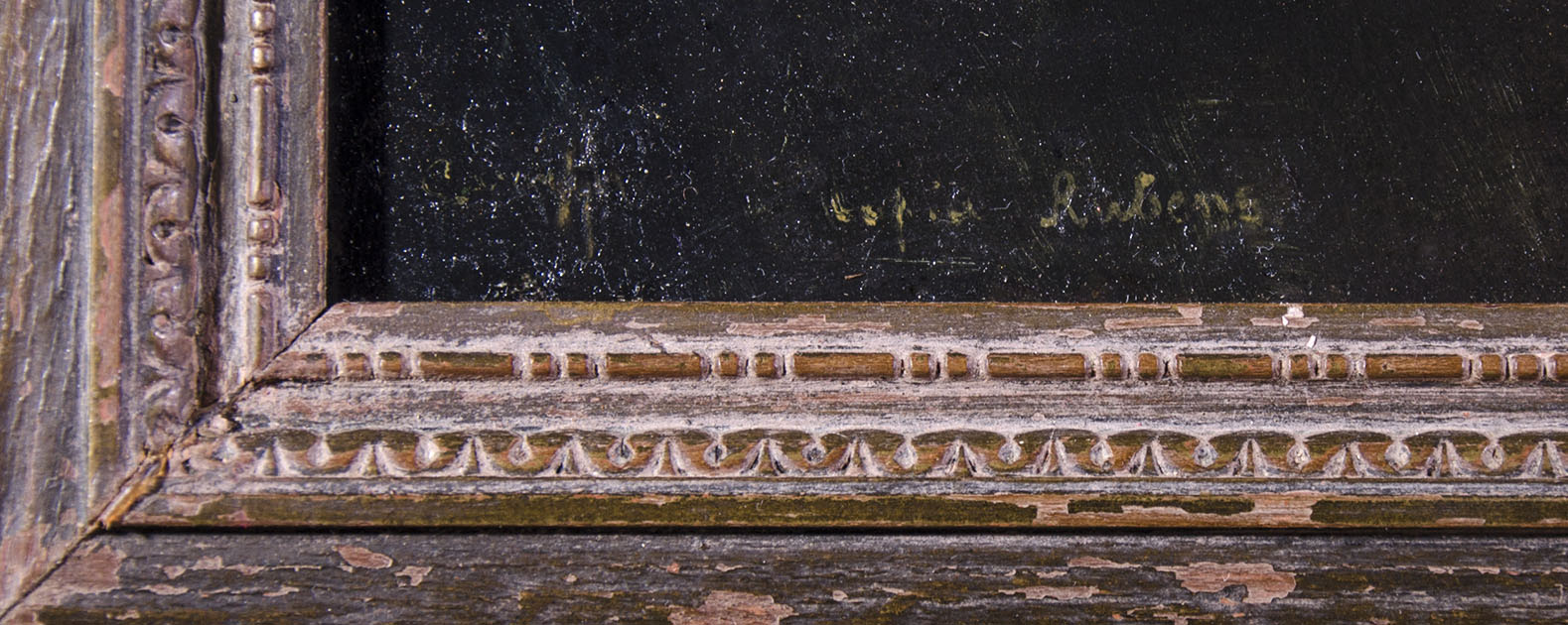 Óleo sobre cartón. Medidas: 50 x 40 cm. Sobre la pintura -hacia su base, en la izquierda de la obra- la leyenda: “Caraffa - Copia Rubens”. La pintura se presenta con su marco original.