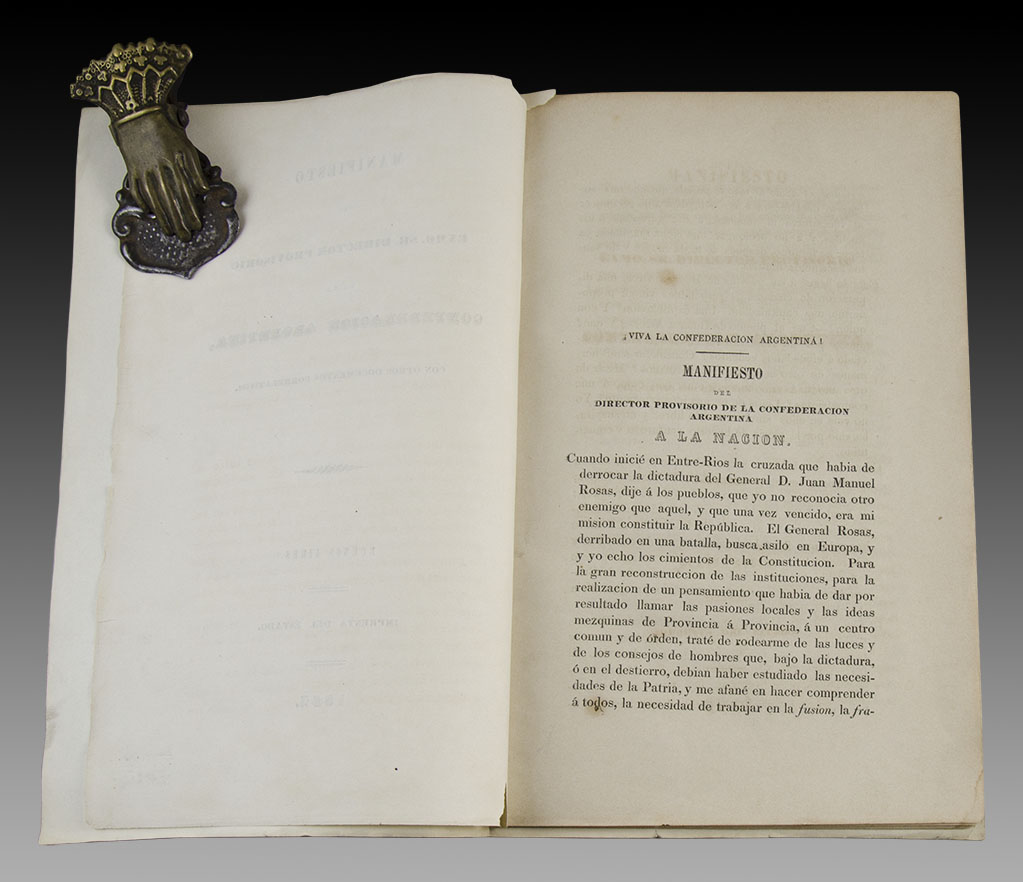 Manifiesto del Exmo. Sr. Director Provisorio de la Confederación Argentina, con otros documentos correlativos. Buenos Aires. Imprenta del Estado. 1852.