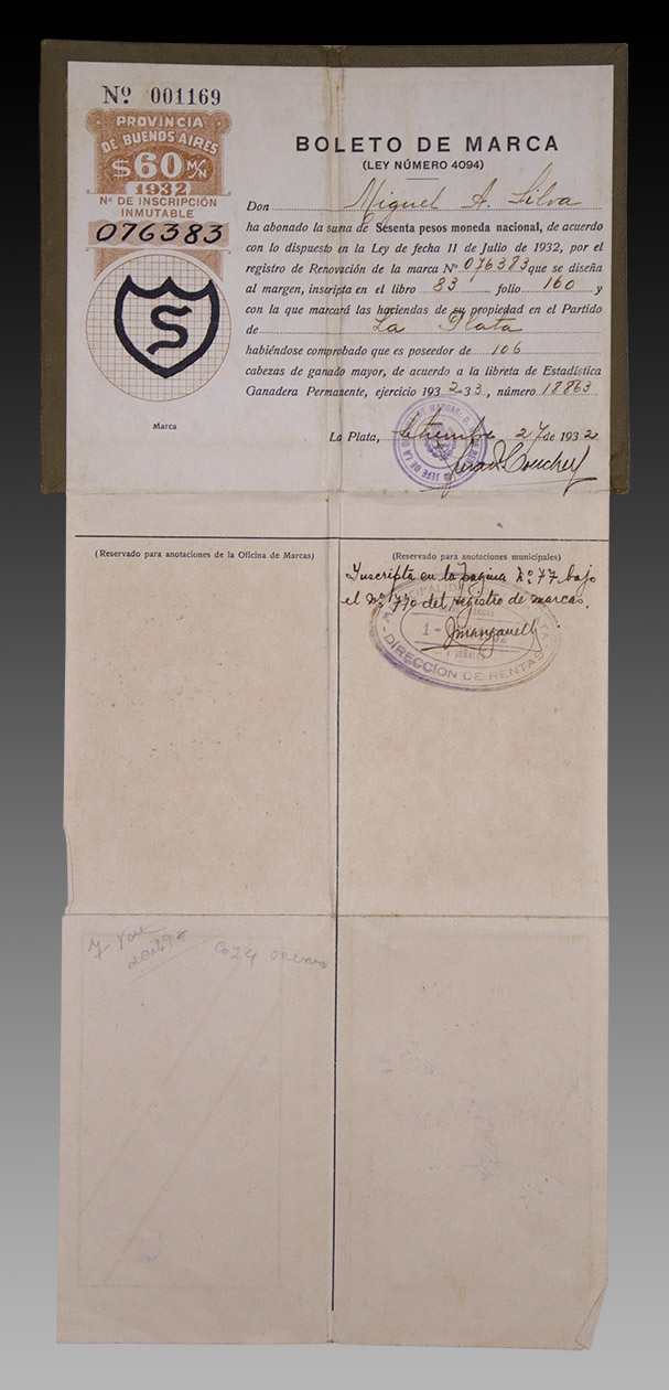 Expedido por la provincia de Buenos Aires en 1932, el presente Boleto de Marca incluye el diseño de la misma y el recibo del pago correspondiente por su renovación, indicando que con ella “marcará las haciendas de su propiedad en el Partido de La Plata”. La documentación está expedida a nombre de Miguel A. Silva.