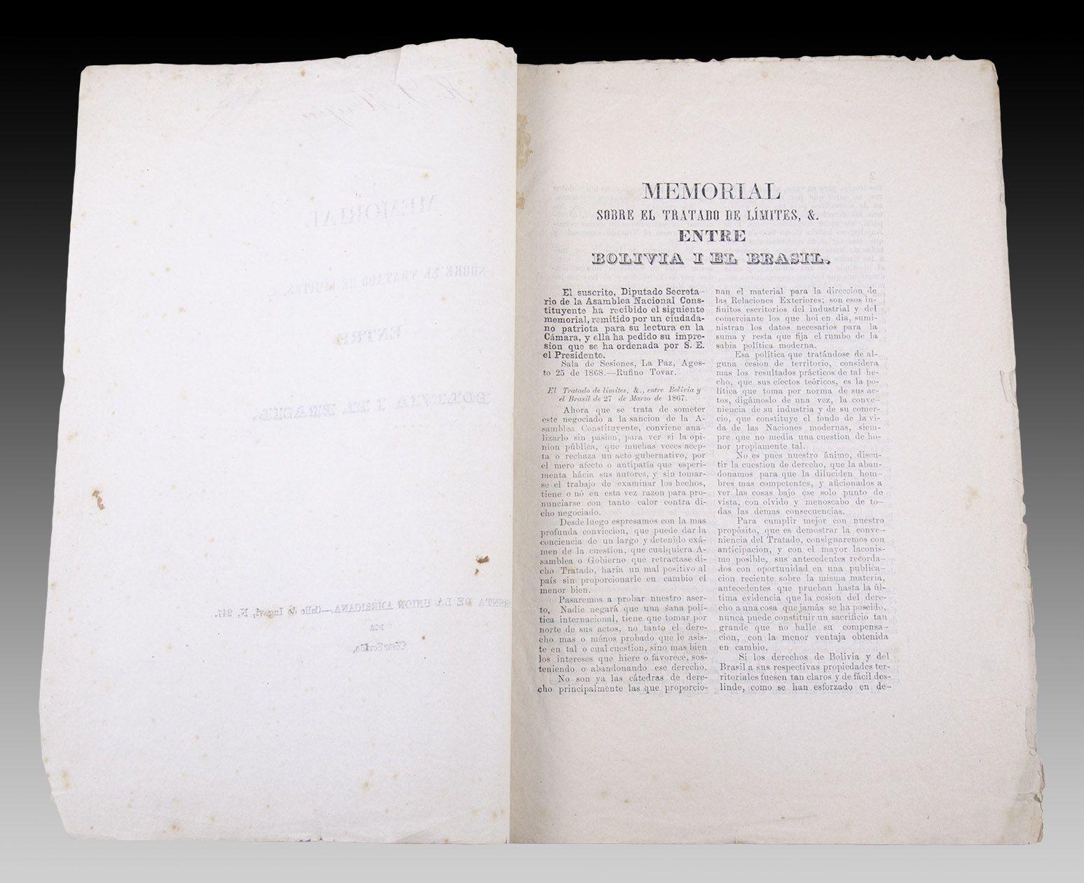 El presente Memorial fue publicado por orden de la Asamblea Nacional Constituyente de Bolivia. El acuerdo con Brasil -el tratado de Ayacucho- firmado por el emperador Pedro II y el presidente Mariano Melgarejo el 27 de marzo de 1867 no fue recibido con entusiasmo por la sociedad boliviana, que consideró una entrega demasiado benevolente a la sesión de tierras ricas en recursos naturales -en especial, la región del Acre-, de sumo interés por la explotación del caucho.
