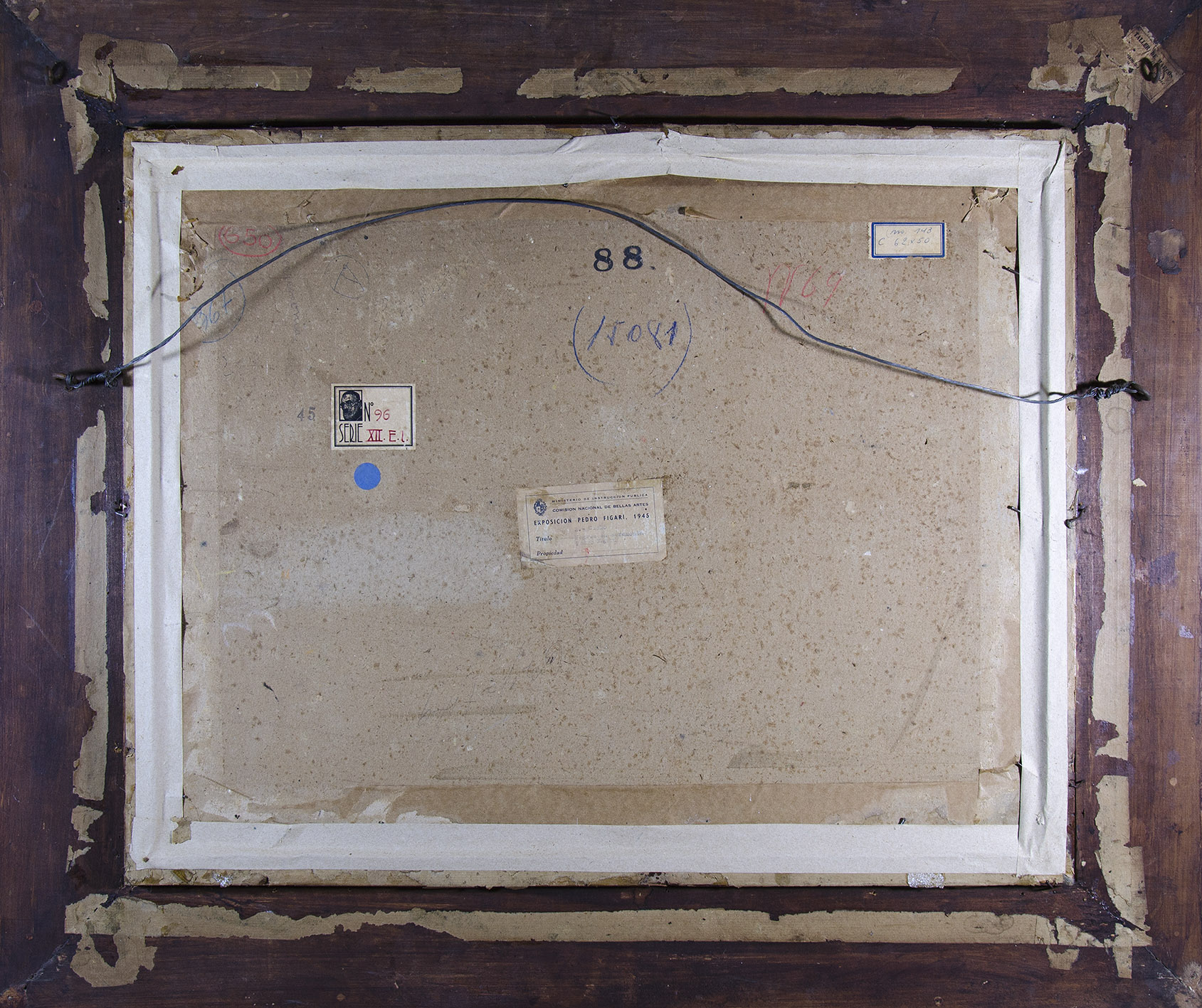 Óleo sobre cartón, Firmado abajo y a la izquierda “P. Figari”. Medidas 48 x 62 cm. Al dorso, tres etiquetas, una de ellas con la leyenda “Ministerio de Instrucción Pública. Comisión Nacional de Bellas Artes. Exposición Pedro Figari, 1945. (Mecanografiado) 2.- Ciclo. Negros en ceremonia. Pedro Figari”. Obra enmarcada, en excelente estado.