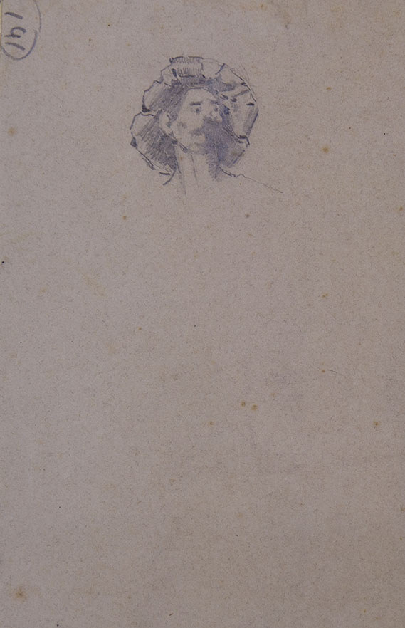 Tinta y lápiz grafito sobre papel. Medidas: 11 x 17,5 cm. Con el monograma del artista “ES” en el ángulo superior derecho en tinta. Preservado en un antiguo paspartú con ventana pintada a mano y la etiqueta “Eduardo Sívori 1847 - 1918 / Estudio - Tinta”. Al dorso el dibujo en lápiz de una cabeza de hombre con sombrero, obra también de Sívori. Ex colección Alfredo González Garaño.