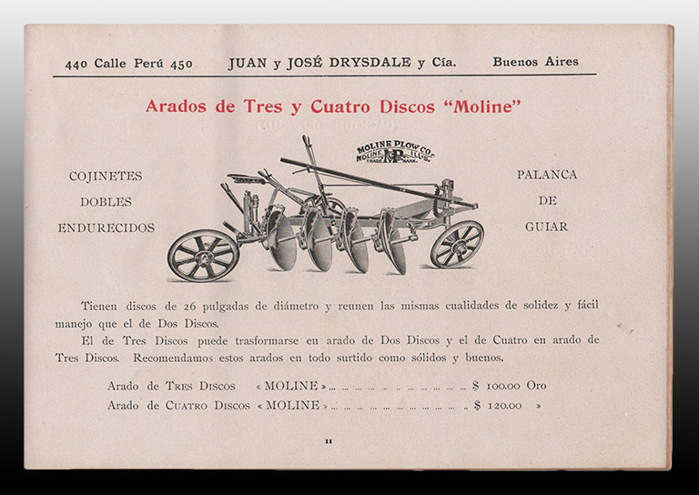 La firma de Juan y José Drysdale y Cía, instalada sobre la calle Perú al 450 de Buenos Aires, distribuía catálogos por todo el país, promoviendo la venta de su maquinaria. Lo hacía con la advertencia que los precios estaban sujetos a variar sin aviso, no obstante indicar que los fijaban en “oro sellado”, convertidos á curso legal al tipo del día en que se haga la entrega… Y estaban en 1905.