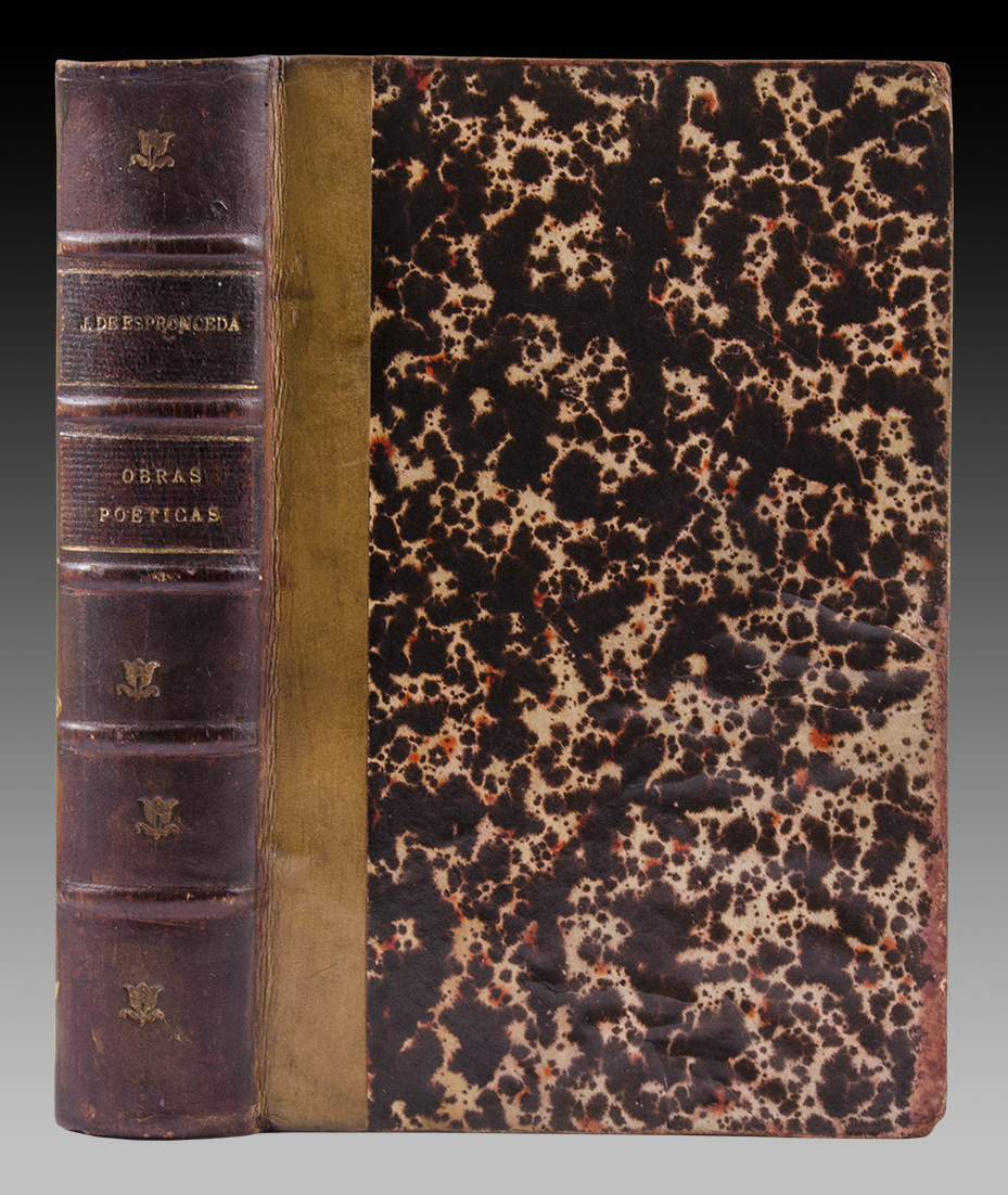 En 4° (17,7 x 12 cm.), Frontis de Espronceda (dibujado y grabado por Ferdinand Delannoy), XIX pp., (incluye Anteportada y Portada), + 504 pp. Encuadernación en medio cuero con títulos dorados. Ejemplar en buen estado, con una vieja huella de agua en el frontis.