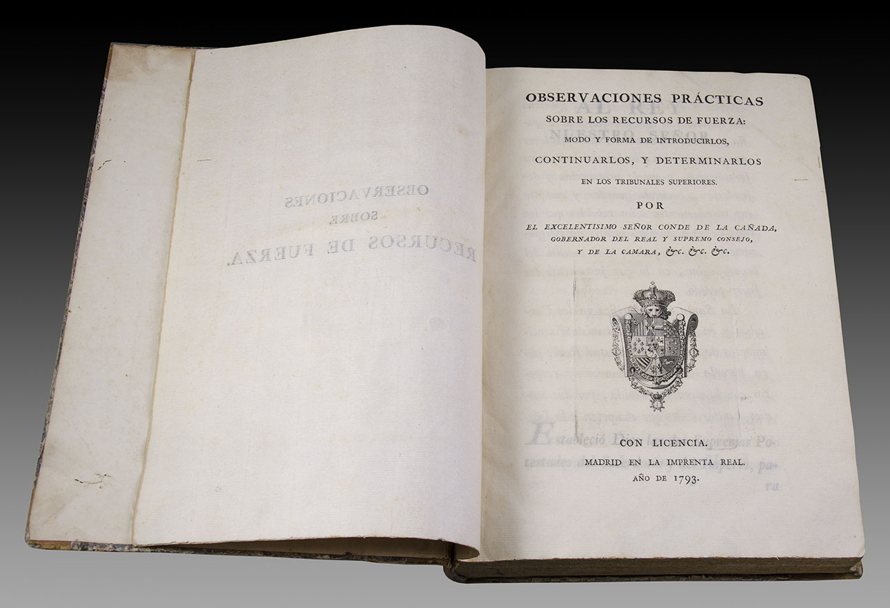 Observaciones prácticas sobre los recursos de fuerza: modo y forma de introducirlos, continuarlos, y determinarlos en los tribunales superiores. Por El excelentísimo Señor …, Gobernador del Real y Supremo Consejo y de la Cámara. (Escudo). Con Licencia. Madrid en la Imprenta Real. Año de 1793.