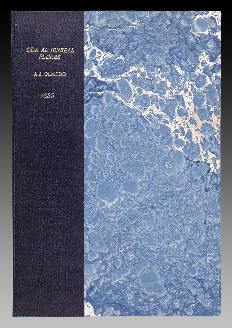 Raro. Canto al héroe ecuatoriano. En 4º (26,5 x 18 cm.), 8 pp. Encuadernación en pasta española, lomo de cuero con títulos dorados. No en Palau. Primera edición.