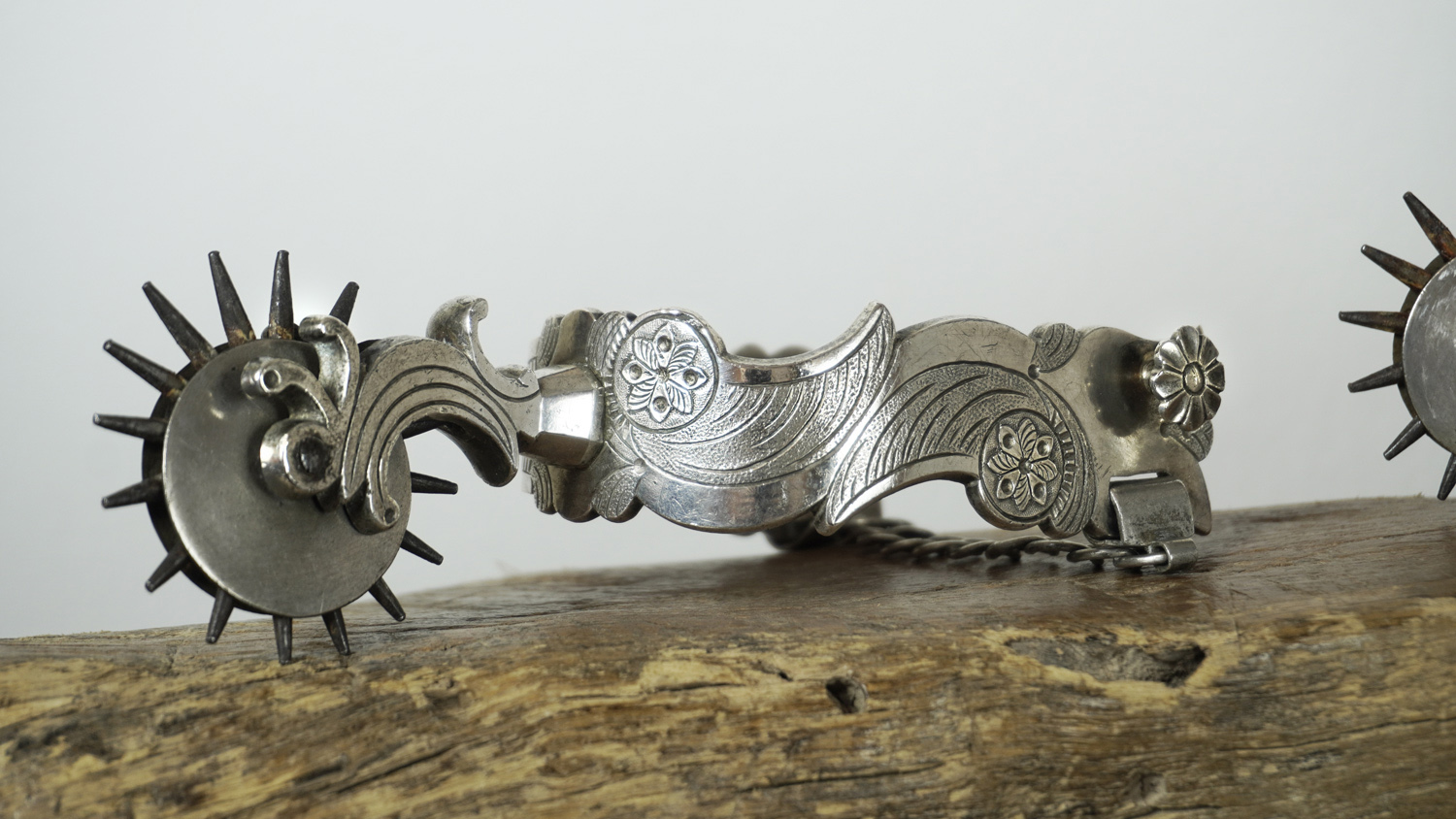 Su arco, de bordes quebrados, lleva en la cara externa dos flores cinceladas y senda hojas que recorren el sector. Sin rodete, el pihuelo es de gran factura, con un eje facetado, una pestaña hacia lo alto y el último tramo con líneas muy dinámicas que agradan a la vista. Llevan rodajas de hierro de puntas recortadas y guardapolvos lisos de plata. Ambas presentan un bajoempeine de cadenas, sin correajes.
