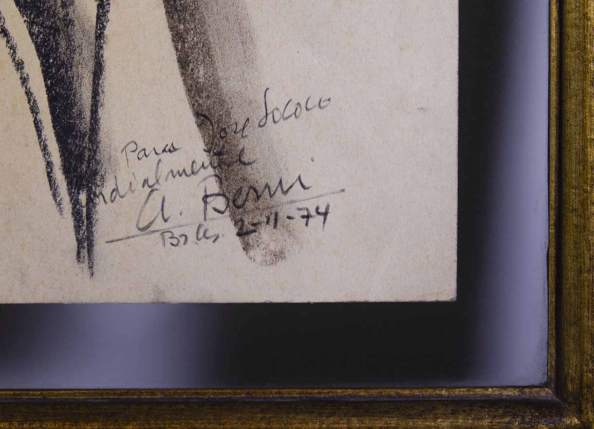 Obra sobre papel. “Sanguínea (sic) y lápiz año 1955”; firmada, fechada y dedicada por el autor: “Para José Lococo cordialmente A. Berni. Bs. As. 2-4-74”. Medidas: 65 x 50 cm. Obra en buen estado, enmarcada.