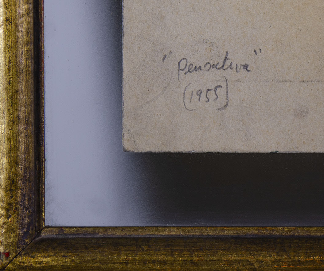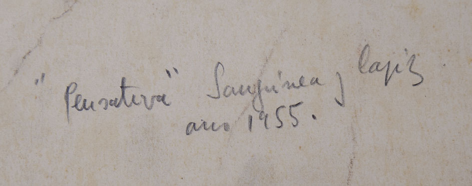 Una joven mujer apoya su cabeza sobre su mano, y, pensativa -tal es en efecto el título original de esta obra- mira ligeramente hacia lo alto en un potente retrato. El claroscuro sobre la piel de la muchacha vislumbra un fuerte pómulo, una frente amplia. El pintor nos hace evidente lo óseo de nuestra existencia. En contraposición, los rasgos de sus facciones son tiernos, con su nariz respingada y sus labios rosados. La obra se encuadra estilísticamente dentro de lo que el propio artista denominó Nuevo Realismo, término que formalizó en 1936 al publicar en Forma el artículo “El nuevo Realismo” [1]. A su vez, podría recordarnos a la expresión y posición de La mujer del sweater rojo, obra realizada un año antes de aquella publicación, en 1935. Si en la pintura predomina el estado melancólico, en este dibujo veinte años posterior, esa melancolía se torna en una actitud reflexiva, aunque sería arriesgado suponer una vinculación de su gesto con los sucesos de ese año crucial en la historia argentina.