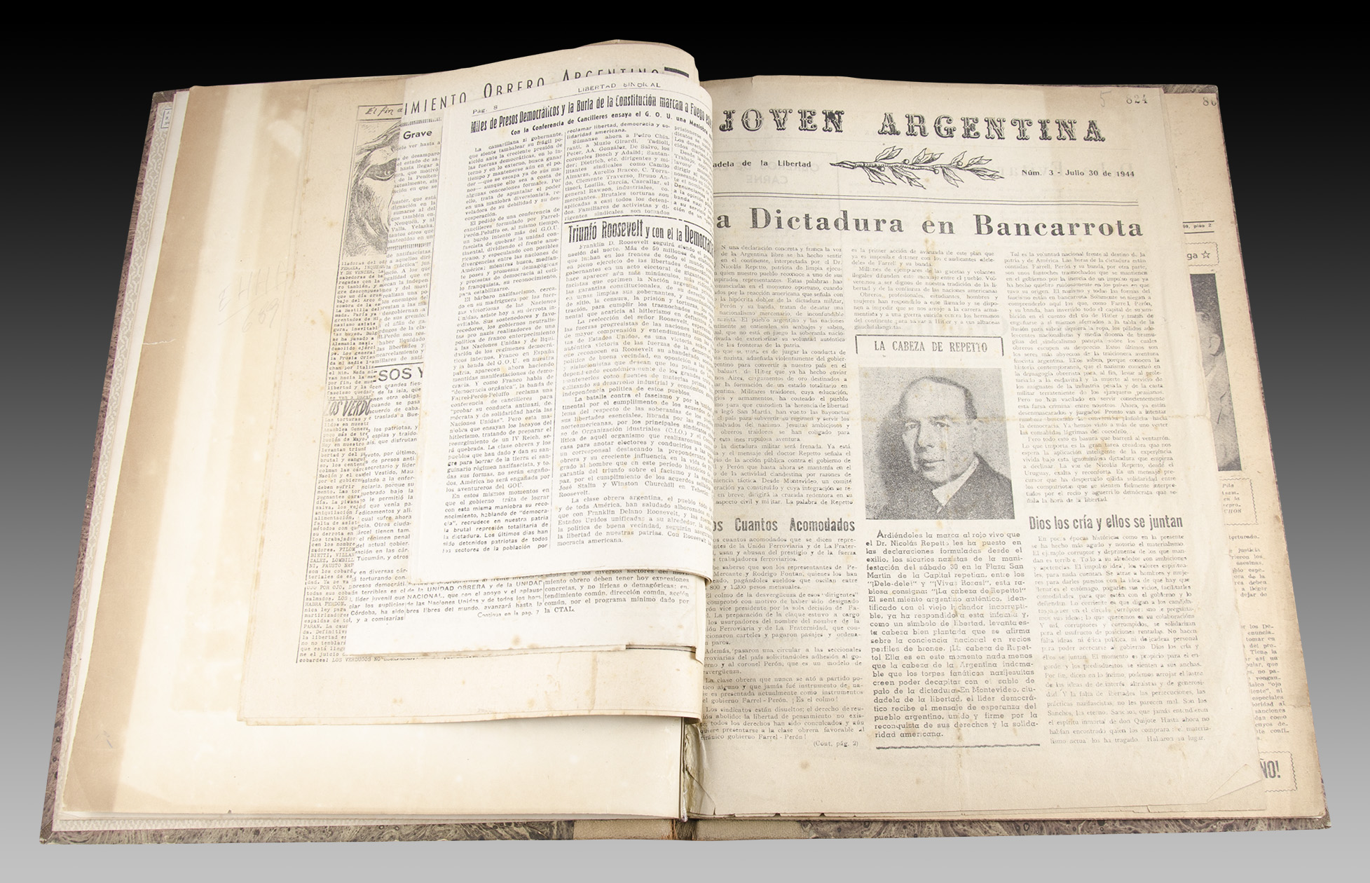 Excepcional conjunto de periódicos, en su mayoría de circulación clandestina, que se oponían abiertamente al gobierno emanado del golpe militar del 4 de junio de 1943 que derrocó al presidente Ramón S. Castillo. El nuevo gobierno fue presidido por Ramírez siendo Farrell ministro de Guerra y Juan Domingo Perón titular de la novedosa Secretaría de Trabajo y Previsión. Iniciaba así Perón su carrera política coronada por la victoria en las elecciones presidenciales del 24 de febrero de 1946. He aquí un notable conjunto de periódicos opuestos a la gestión de esta dictadura militar, para los opositores, de claro espíritu fascista. Todos los ejemplares en buena forma, encuadernados en un volumen. Con ex libris de Federico Vogelius.