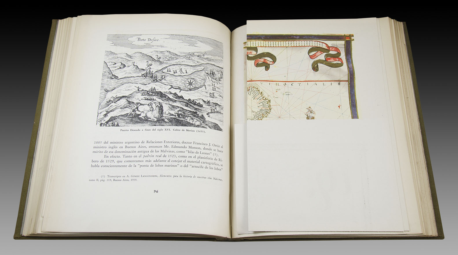 Estudio de los descubrimientos de los marinos españoles. Entre otras observaciones incluye la afirmación “que las Islas Malvinas fueron descubiertas en la expedición de Magallanes, como lo afirmó el cosmógrafo Santa Cruz en 1541. La obra se ilustra con magníficas reproducciones facsimilares de mapas históricos, como el mapa de Olives y Joan Martinez de 1572, Patagonum - Tierra del Fuego, o su Typus Orbis.