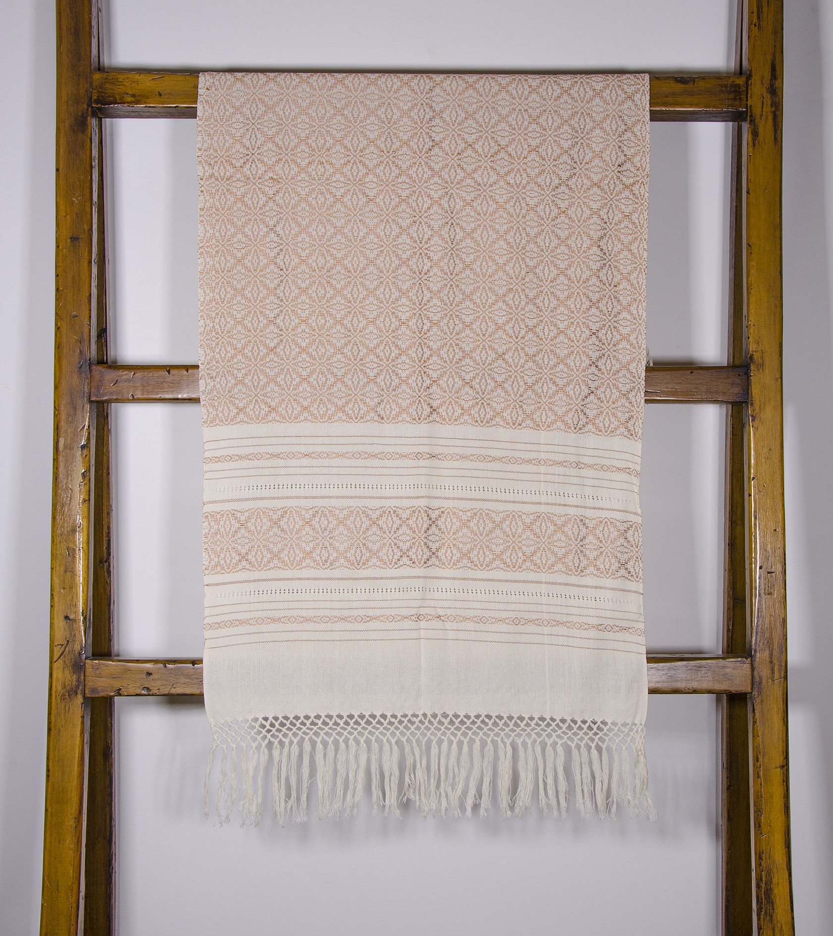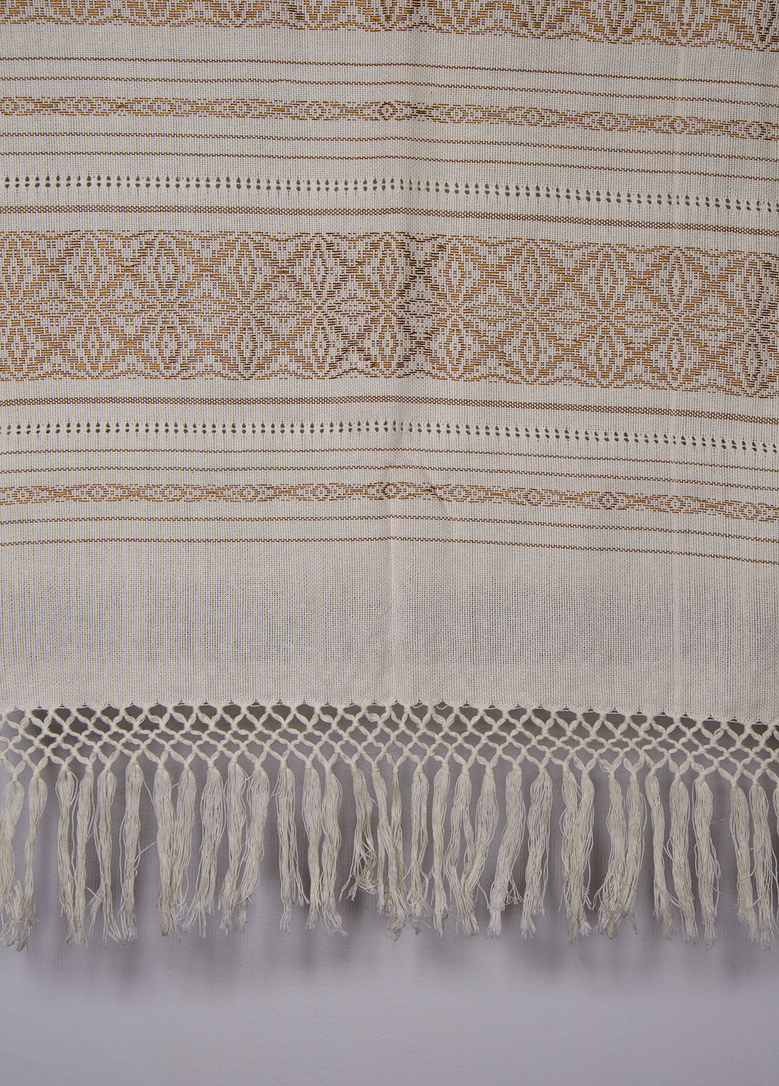 Pieza tejida con hilados de algodón y de seda, en telar de cintura, por tejedoras de Mitla, ubicadas a 600 km. al sur de la ciudad de México. Su estructura ha sido concebida con la técnica de tejido balanceado (trama y urdimbre a la vista), para lograr una tela liviana y fina. El complicado diseño floral de trama de doble faz, logrado con los hilos de seda que surcan la urdimbre de algodón, encierran un detalle íntimo y secreto a los ojos del común de la gente: los pétalos de las flores son en realidad figuras geométricas presentes en los frisos y paredes de la antigua ciudad de Mictlan.
