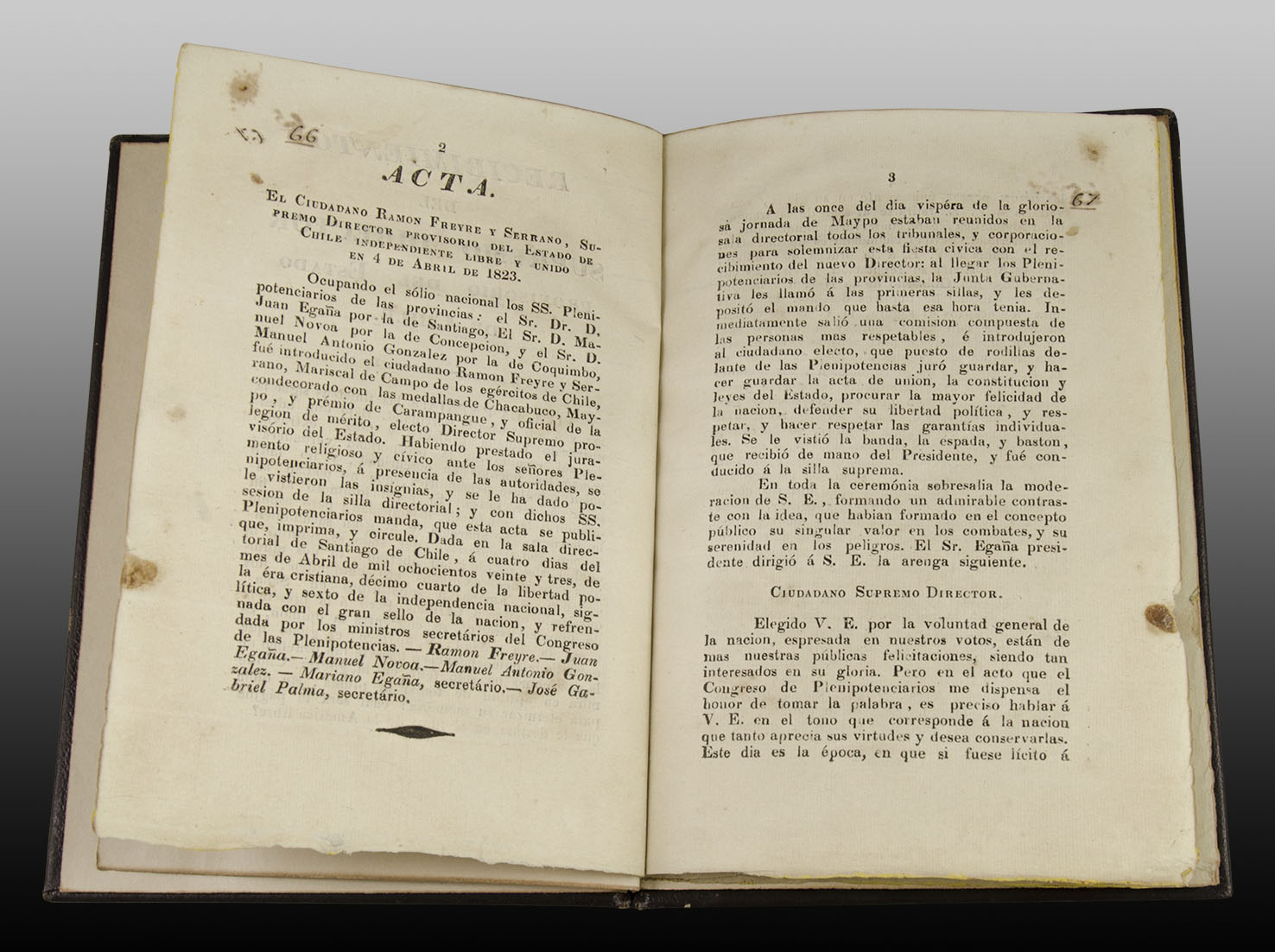 Acta de nombramiento y relato de las ceremonias de jura y festejos que acompañaron la designación de Ramón Freire -Mariscal de Campo de los ejércitos de Chile, condecorado con las medallas de Chacabuco y Maypo-, como Director Supremo Provisorio de Chile. Freire participó en la Guerra de la Independencia y después de la derrota de Rancagua, debió exiliarse en Buenos Aires. Aquí se incorporó a la escuadra de Guillermo Brown y más tarde se unió al Ejército de los Andes. San Martín lo envió a tomar la ciudad de Talca, tarea que realizara exitosamente, y después de varios combates cumplió un elogioso desempeño en la batalla de Maipú, por el que fue condecorado.