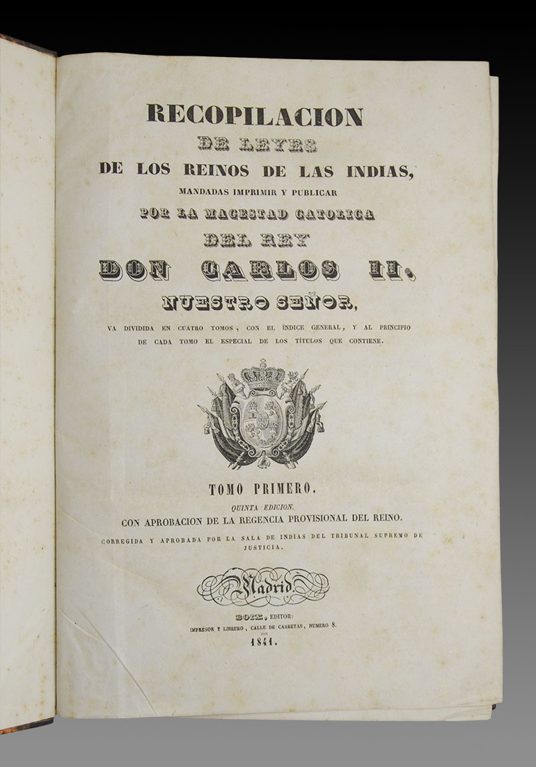 Recopilación de Leyes de los reinos de las Indias, mandadas imprimir y publicar por la Magestad Católica del Rey Don Carlos II, (...) Madrid. Boix, editor: impresor y librero. 1841.