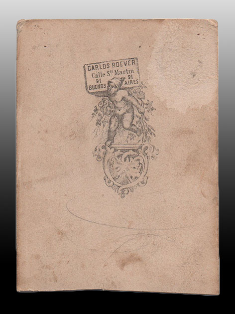 Information about the German photographer Carlos Roever is really scarce; in our collection of trade guides we locate it established in Buenos Aires between the years 1862 to 1866 and always with a single portrait studio on 91 San Martín Street. This European professional operated at the height of the French format "carte-de-visit "; only two advertisements are known stamped on the back of his works, this one with the little angel's vignette and another stating: "Photograph of Carlos Roever. Calle S. Martín 91. Buenos Aires". Closely linked to the foreign community of Buenos Aires, Carlos Roever portrayed Robert C. Kirk, Minister Plenipotentiary of the United States, around 1863.