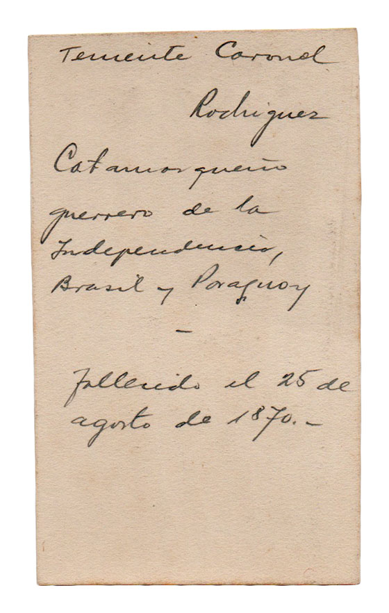 Retrato fotográfico vintage. Copia en papel albuminado. Formato "carte-de-visite: 9,4 x 5,5 cm. Tono sepia. Retrato coloreado (iluminado). Soporte secundario: cartulina rígida de 9,4 x 5,5 cm, en cuyo dorso aparecen textos manuscritos en tinta negra: "Teniente Coronel Rodríguez. Catamarqueño guerrero de la Independencia, Brasil y Paraguay. Fallecido el 25 de agosto de 1870." Obra en buen estado de conservación. Ex colección Federico Vogelius.