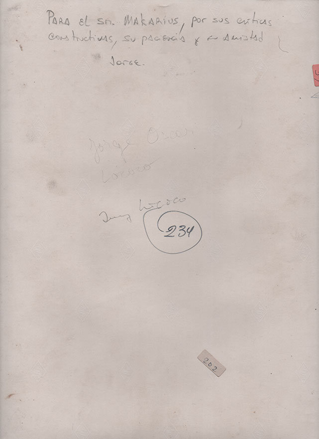 Obra fotográfica vintage. Copia a la gelatina de plata en blanco y negro de textura brillante, sin márgenes blancos. Medidas: 30,2 x 24 cm. Fotografía suelta. En el reverso y al centro de la misma se ubica el número 234 dentro de un óvalo, y la firma del fotógrafo. Más arriba, el texto manuscrito del propio autor en lápiz grafito y con la importante dedicatoria: “Para el Sr. Makarius, por sus críticas constructivas, su paciencia y su amistad. Jorge”.