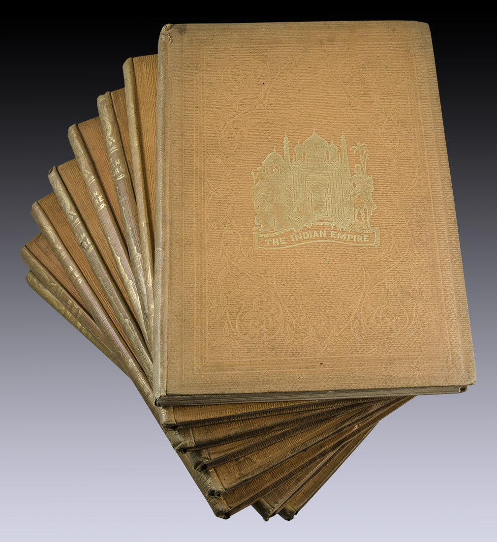 Monumental estudio con la "historia, topografía, población, gobierno, finanzas, comercio y productos básicos" del Imperio en la India. Su autor, Robert Montgomery Martin (1801 - 1868), funcionario anglo-irlandés, sirvió como Tesorero Colonial de Hong Kong -el imperio británico recién había adquirido la isla- en 1844 y 1845. Fue miembro fundador de la Sociedad Estadística de Londres, la Sociedad Colonial y la Asociación de las Indias Orientales. A lo largo de su vida se ocupó de escribir diversas obras sobre la India, incluso fundó y dirigió la Revista Colonial a lo largo de dos años. También publicó la Historia de las Colonias Británicas en cinco volúmenes, pero se lo recuerda en especial por su obra 'The Indian Empire'.