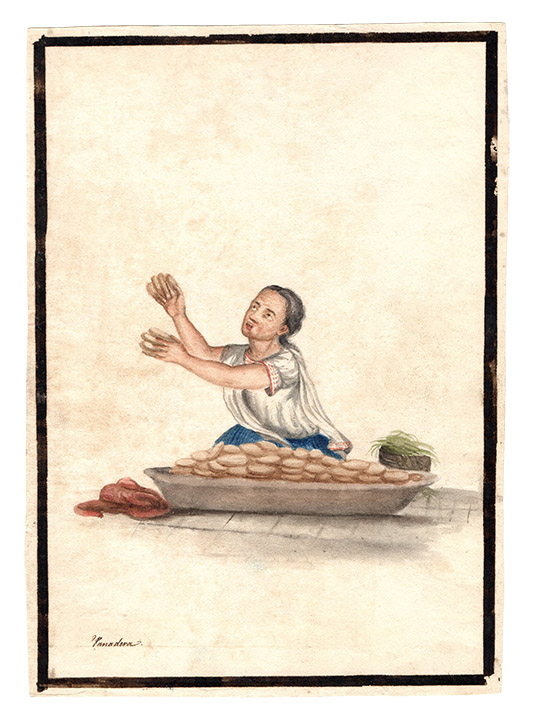 El trigo local abastecía de harina para la elaboración del pan consumido por las clases populares, como lo testimonia nuestra "panera" con su venta callejera y "de ocho". Un cuenco de madera de generosas dimensiones contiene distintos panes. Viste blusa y falda.