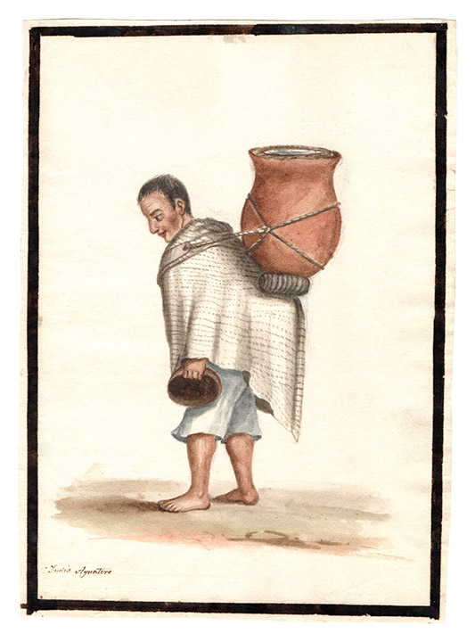 La representación del aguatero fue minuciosamente estudiado por Alexandra Kennedy - Troya en la obra Imágenes de Identidad. Acuarelas quiteñas del siglo XIX (Quito, Fonsal, 2005), dedicándole un extenso ensayo a su representación a través de aquella centuria. Por su parte, Ernest Charton así los describe en 1862: “Una tira de cuero que pasa por el pecho retiene la enorme jarra, cuyo equilibrio sobre la espalda fuertemente encorvada aseguran mediante un pequeño cojín de paja. El peso que cargan así no es inferior a ochenta o cien kilogramos, y por la módica suma de un cuartillo es por lo que estas pobres gentes van, con frecuencia, a muy grandes distancias, con tan pesada carga”. (En Quito a través de los siglos, t. II, Quito, Imprenta del Ministerio de Gobierno, 1941, p. 130)