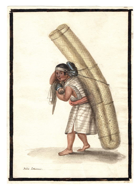 Estos indígenas artesanos llegaban a Quito con sus productos para la venta. Aquí la vemos transportando una estera, de gran demanda, para uniformar el suelo de las viviendas residenciales. Se utilizaba la totora como materia prima y realizaban esta labor en las regiones lacustres y palustres de los valles andinos.