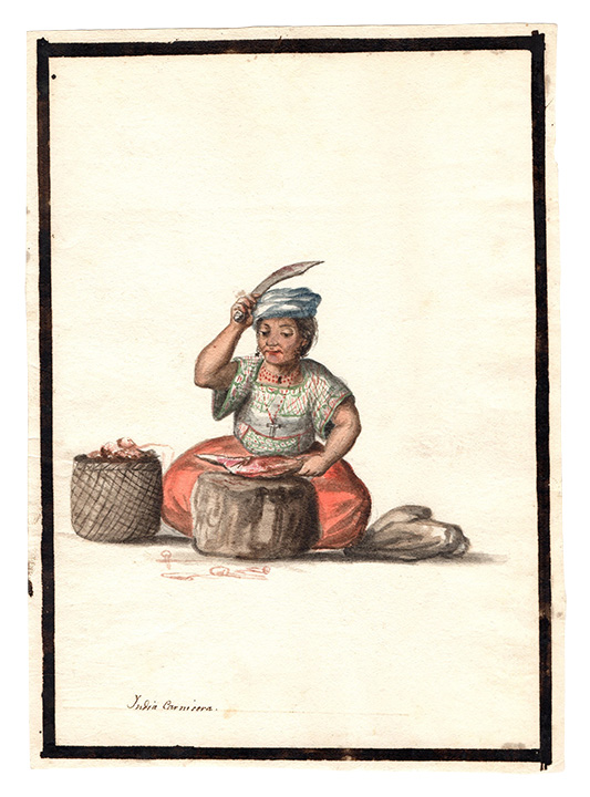 En pleno centro de Quito, donde también funcionó la principal plaza de toros hasta 1867, se encontraba la carnicería con un gran corral en las cercanías donde se encerraba el ganado para el desposte. Entre las poblaciones indígenas, esta actividad dio como resultado un negocio asociado al faenamiento y venta al detal de productos cárnicos. La carnicera en este caso permanece sentada mientras prepara un corte blandiendo un cuchillo de hoja curva -para devastar-, en tanto conserva su mercadería dentro de un gran cesto ubicado a su derecha. Viste una blusa de mangas cortas y una falda amplia, y lleva una cruz al pecho y un tocado en su cabeza.