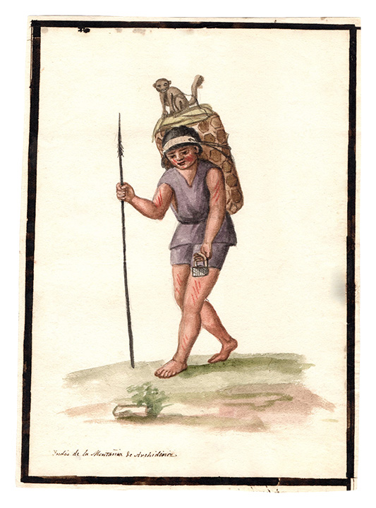 Se los conoce como indios del Napo, un caudaloso río tributario del Amazonas, que corre por las proximidades de Archidona. Miguel M. Lisboa en 1866 los registró por las calles de Quito, y así los describió en su "Relación de un viaje a Venezuela, Nueva Granada y Ecuador" (Bogotá, Fondo Cultural Cafetero, 1984, p. 310): "(...) vienen a pie, con más de quince días de jornada, a vender en la capital de la república los frutos de su pequeño trabajo. Van casi desnudos, llevando una pequeña tanga o calzoncillos y un poncho muy angosto; y así desabrigados, arrostran las lluvias y atraviesan los páramos helados de la cordillera oriental, (...) cargando en las espaldas los frutos que vienen a vender. " El joven aquí retratado lleva un arpón enastado en su mano derecha y una pequeña cesta de fibras en la izquierda. Sobre su carga, un mono viaja con él. (Cita: pp. 220-223.)