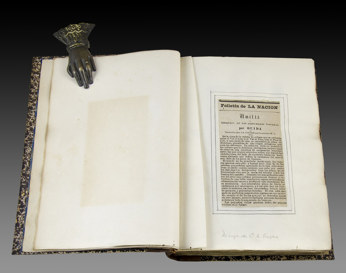 Ejemplar único, encuadernado con lomo de cuero y títulos dorados, formado de modo artesanal, con los recortes de los textos publicados en los diarios La Nación y La Libertad -reúne tres obras-, e ilustrado con delicadas viñetas originales, al parecer, obra de Carlos Ambrosio Lezica, el padre de Martina, la traductora de estos textos.