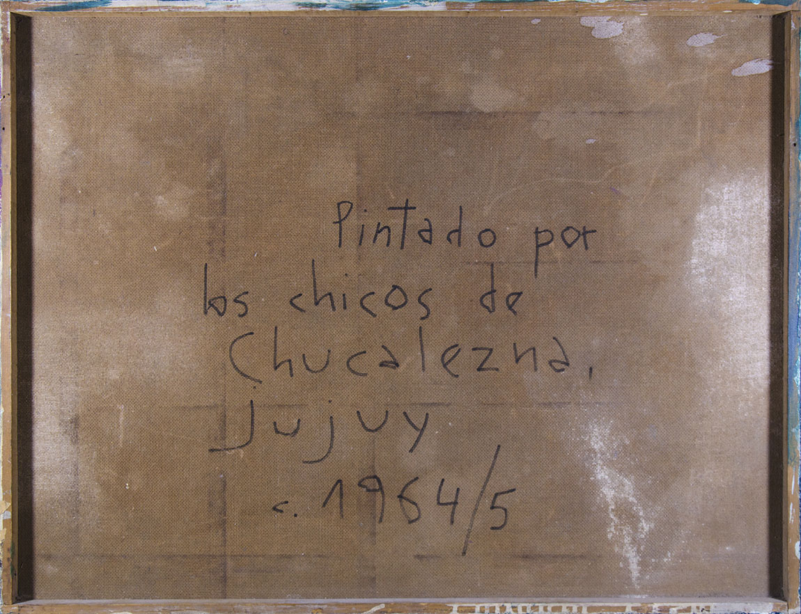 La obra fue realizada por un alumno de la escuela rural de Chucalezna (Quebrada de Humahuaca, Jujuy, Argentina). Vemos a aquel niño de quizás once años avanzar con su pincel e imaginación en el film de Jorge Prelorán que lleva por título el nombre de esa localidad, financiado por el Fondo Nacional de las Artes en el llamado Relevamiento Cinematográfico de Expresiones Folklóricas Argentinas, bajo la coordinación y asesoría general de Augusto Raúl Cortazar. [2] Desconocemos el nombre del artista, ese niño que hoy quizás camina por las calles de su pueblo, sigue inclinando su espalda sobre el surco para sembrar esperanzas y clava la vista sobre los cerros disfrutando de silencios y cielos únicos.