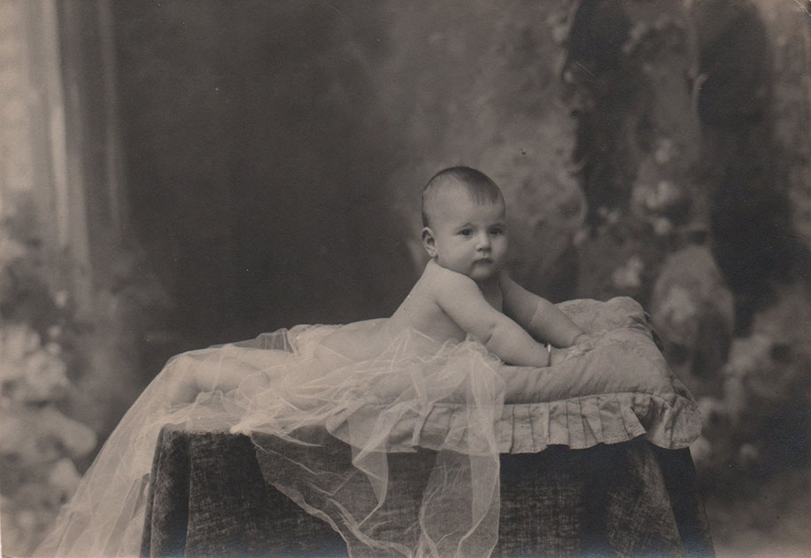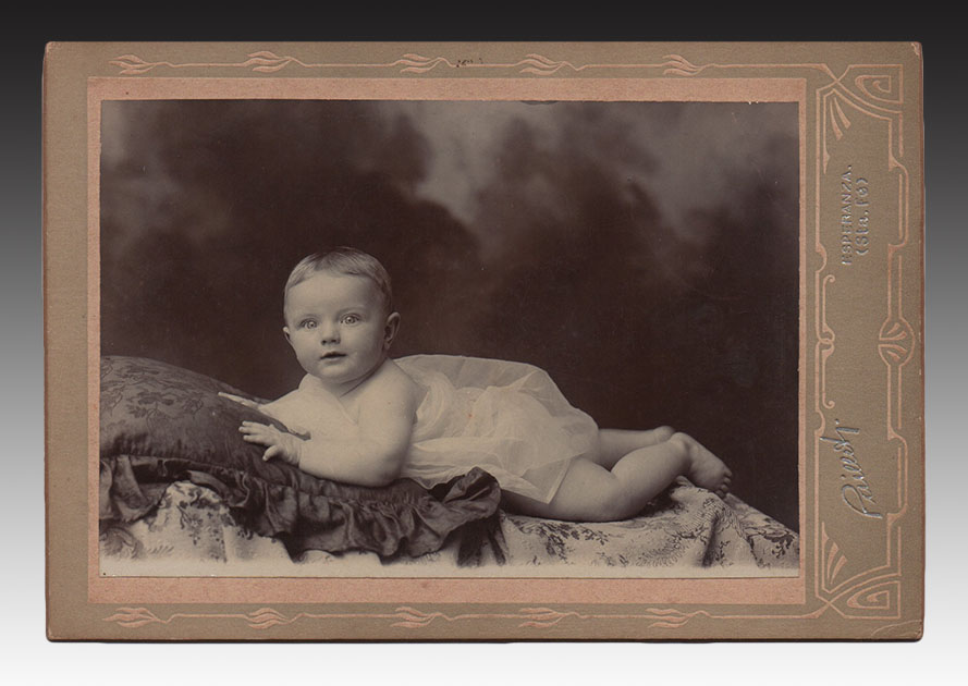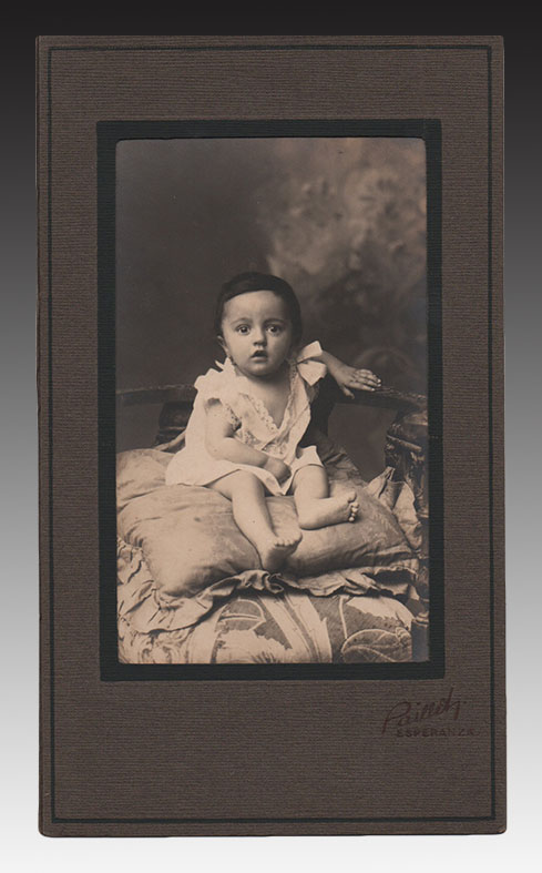 In the images, a wonderful self-portrait of the photographer with his violin under his arm and leaning on the art noveau railing of a staircase used in his studio as a set for his compositions, with a sky in the background. Also, a girl dressed in black, posing in Paillet's studio, next to a chair and a small table; these are two shots of the same session, one gelatin silver copy, the other on a postcard. And three portraits of children; a loose copy, with a baby shown on a cushion with its torso raised, naked, and with its tail and legs covered by tulle. The other two baby portraits, one vertical and the other landscape, are presented mounted on cardboard from Paillet's studio. No minor detail can be observed in the set, all the backgrounds have some kind of texture, they are never smooth. Painted curtains emulate skies, vegetation or rococo interiors.