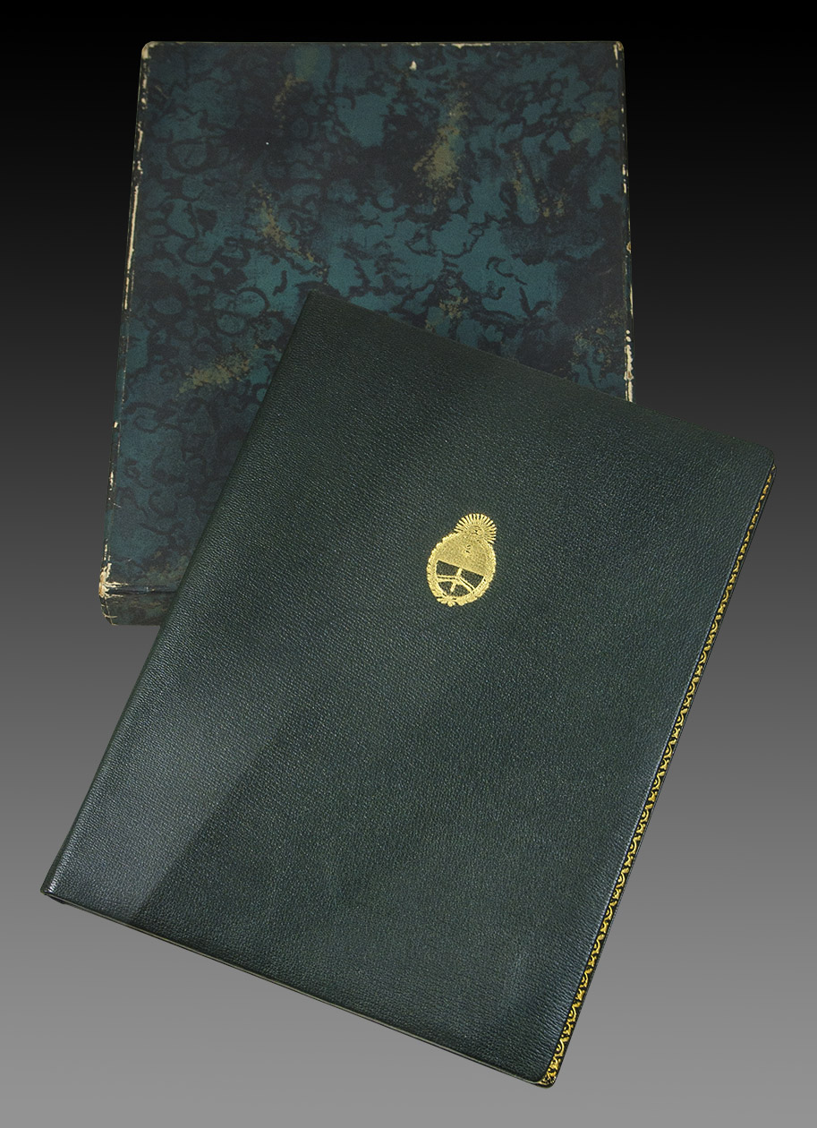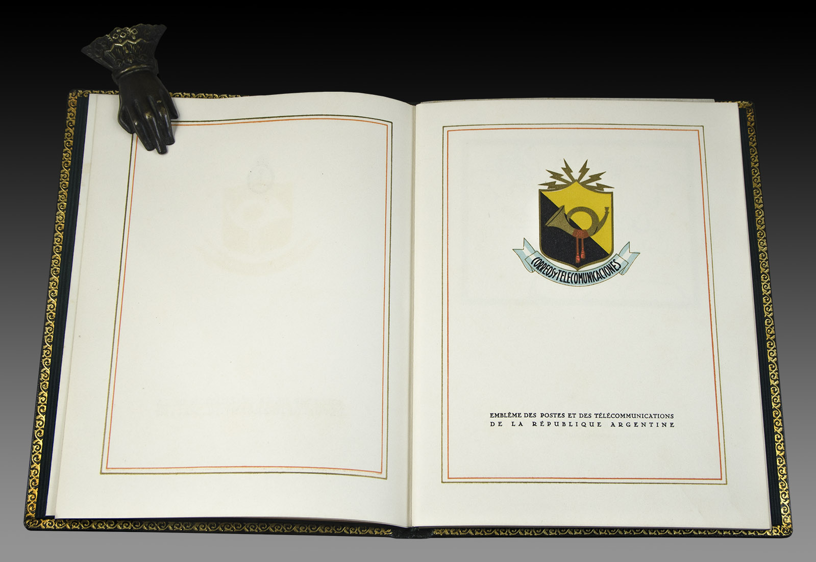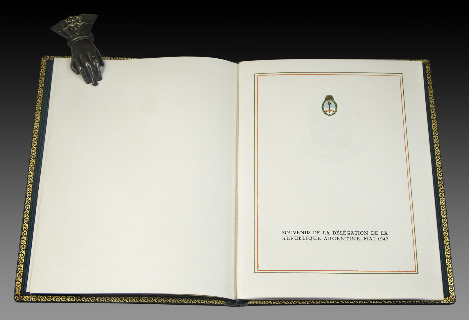 Muy raro. En 4° (25,5 x 19,5 cm), 14 hojas, con dos mapas. Encuadernación de lujo en pleno cuero marroquin azul con el escudo nacional en dorado, y guardas enteladas. En excelente estado. Este ejemplar perteneció a uno de los 54 realizados especialmente como “souvenir” para los Delegados de los países.