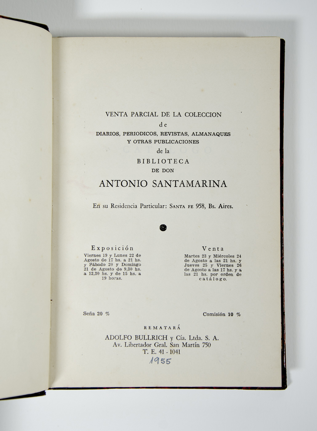 Venta parcial de la Colección de Diarios, Periódicos, Revistas, Almanaques y otras publicaciones de la Biblioteca de Antonio Santamarina. Buenos Aires. Adolfo Bullrich. 1955.