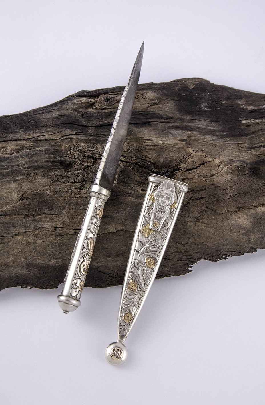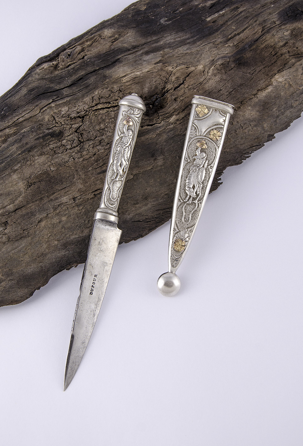 Muy buen logrado cuchillo, con su empuñadura y vaina ricamente cinceladas con motivos florales y aplicaciones de estas últimas en una resuelta combinación de metales preciosos en la cara anterior, y con un jinete domando un potro, en la posterior. En ambas piezas, un soaje galloneado. En la traba, que parece tener un final trunco, muestra una representación mitológica -¿de Medusa?-, y en la puntera, con un diseño singular, las letras aplicadas de su antiguo dueño: AA. Lleva su punzón de autoría: P. S. LLAMEDO.