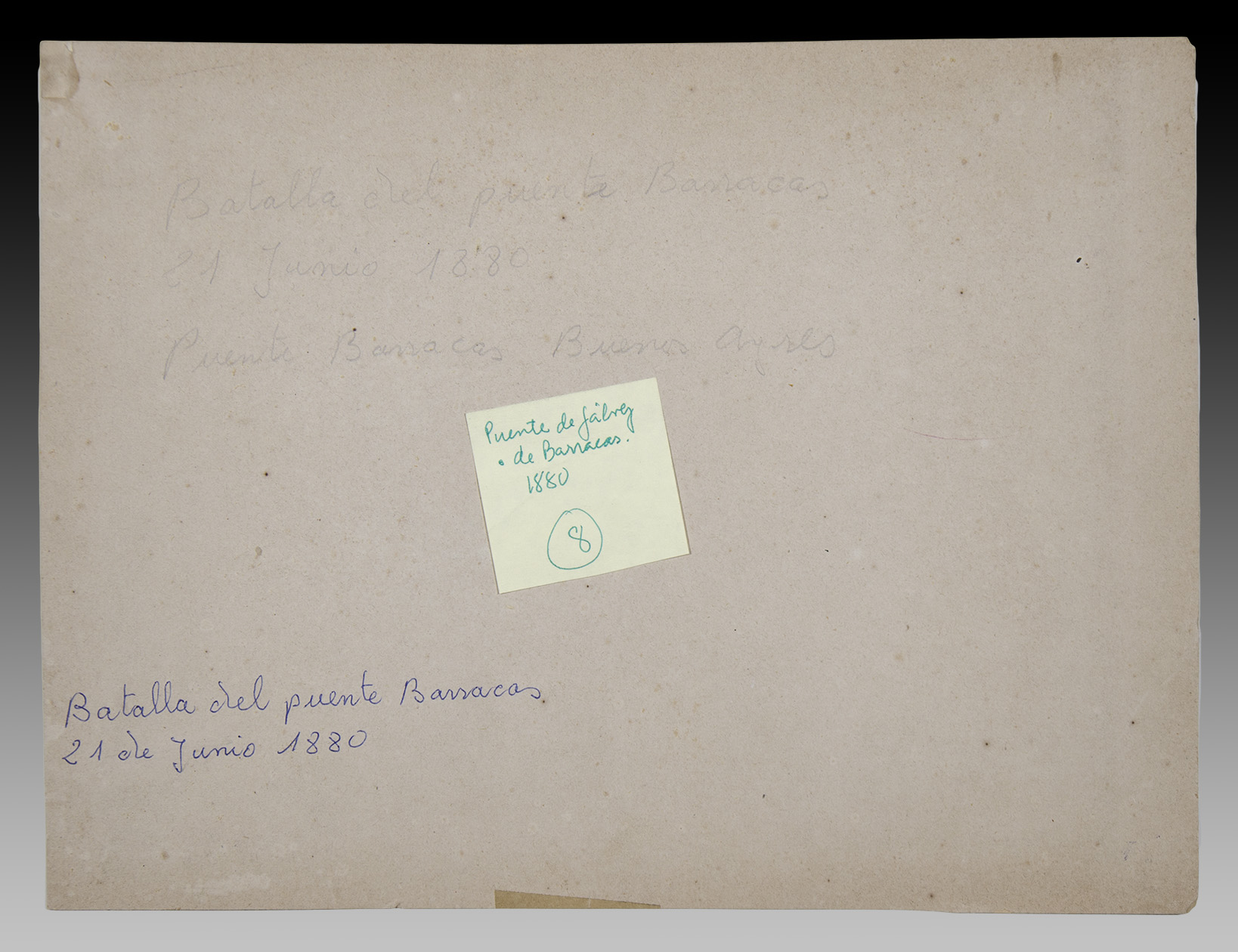 La vista urbana que nos ocupa es entonces un verdadero hallazgo iconográfico pues nos muestra y desde cierta altura, aquel escenario de armas, con un excelente registro sobre el puente de hierro que se inauguró en el año 1871 bajo los planos de ingeniero y pintor Prilidiano Pueyrredón, el que se destruyó durante la creciente del Riachuelo de 1884.