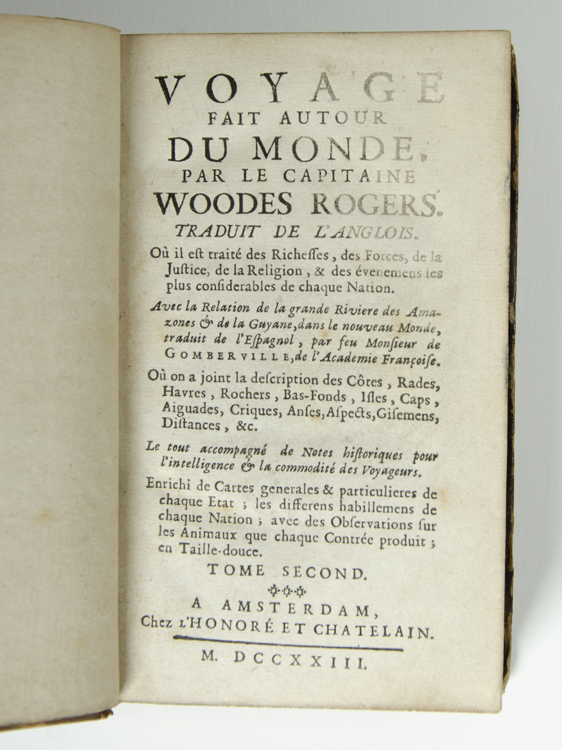 Voyage fait autour du monde, traduit de l’anglois. Où il est traité des Richesses, des Forces, de la Justice, (...) Avec la relation de la grande riviere des Amazones & de la Guyan, dans le nouveau monde, traduit de l’Espagnol, par feu monsieur de Gomberville. Tome Second. A Amsterdam. 1723.